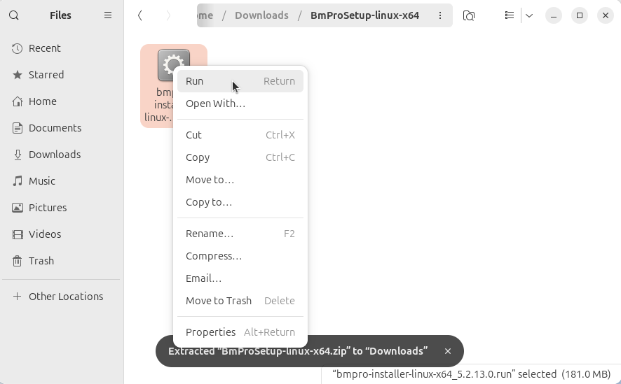 解压之后,打开文件夹,点击【右键菜单】,选择Run (运行),如下图: